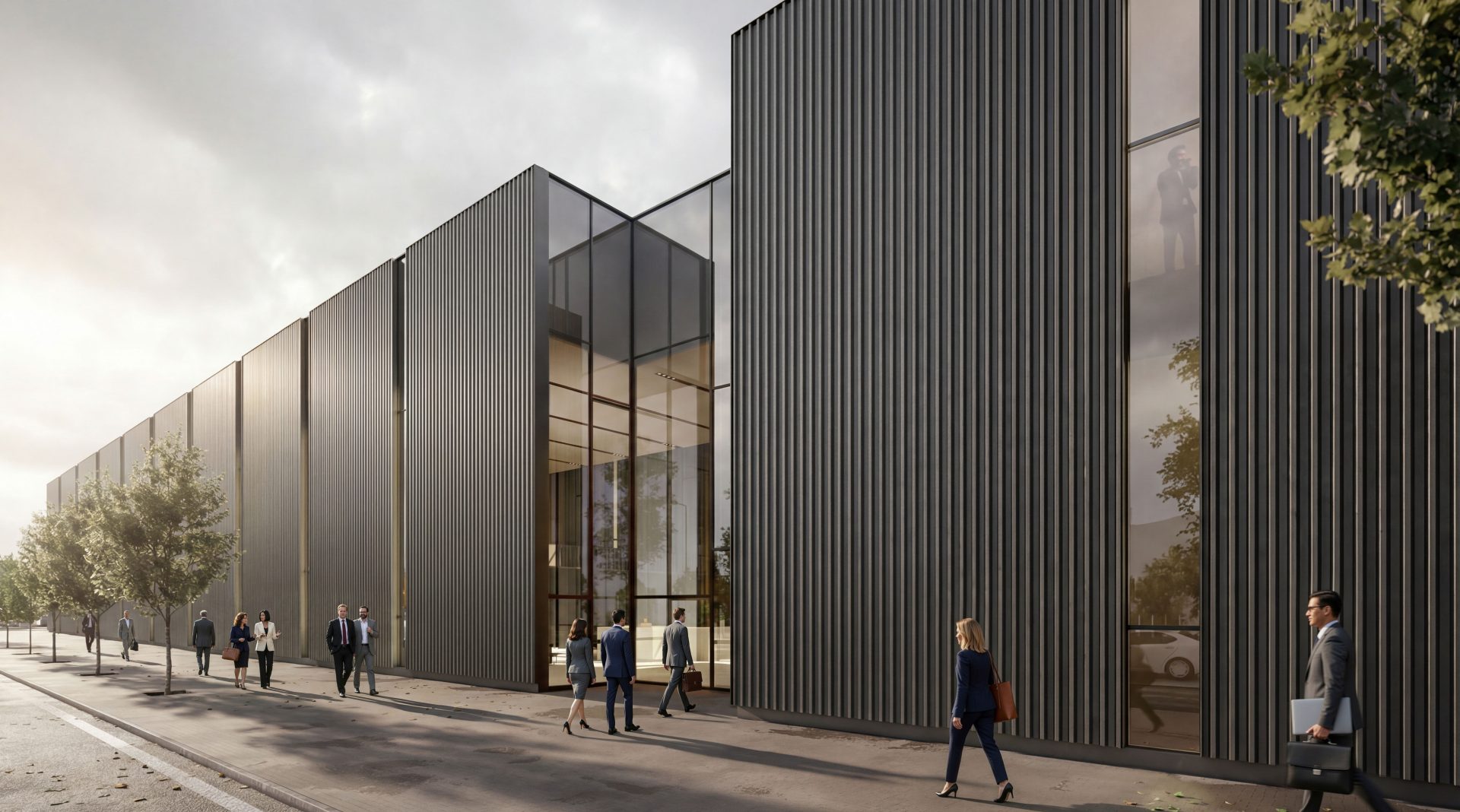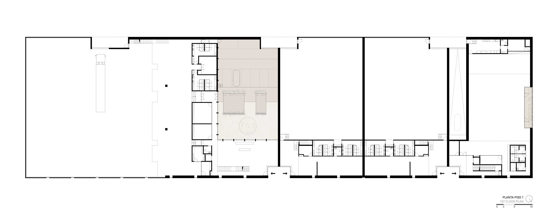 These negatives allow the longitudinality of the architectural piece to be broken, while assuring the due dignity to the entrances of the fractions, since here the business component intends to be highlighted to the detriment of the industrial one.