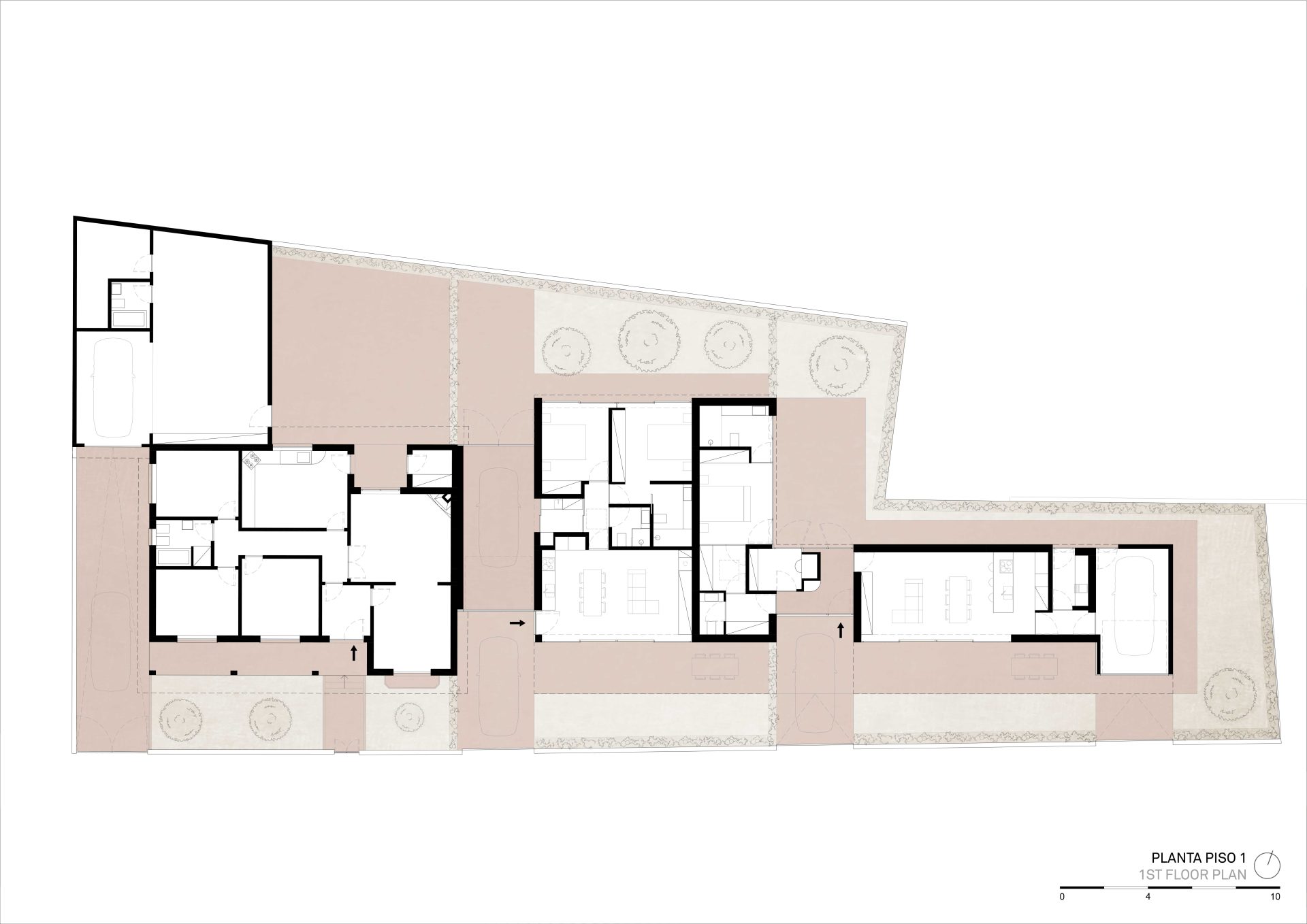 As volumetrias afastam-se através de corpos recuados horizontal e verticalmente. Estes separam as frações como que ditando as propriedades e permitindo ao conjunto arquitetónico assumir um carácter mais integrado na malha urbana onde se insere, de moradias unifamiliares.