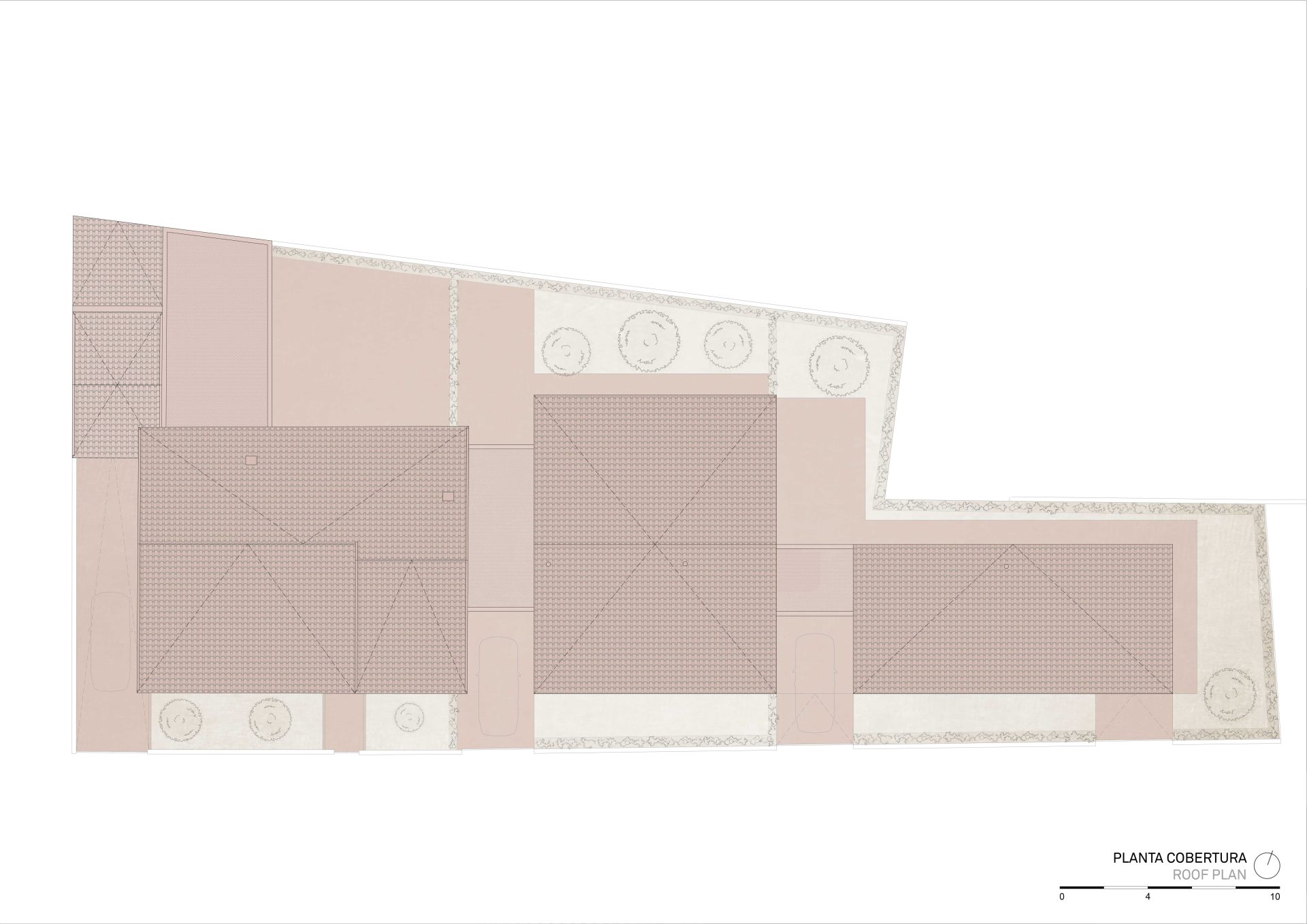 Por sua vez, a ampliação cumprirá esta mesma materialidade, sendo a imagem do conjunto fortemente marcada pela cor terracota, assim como pelas coberturas inclinadas com telha cerâmica tradicional, à semelhança da cobertura do edifício original.